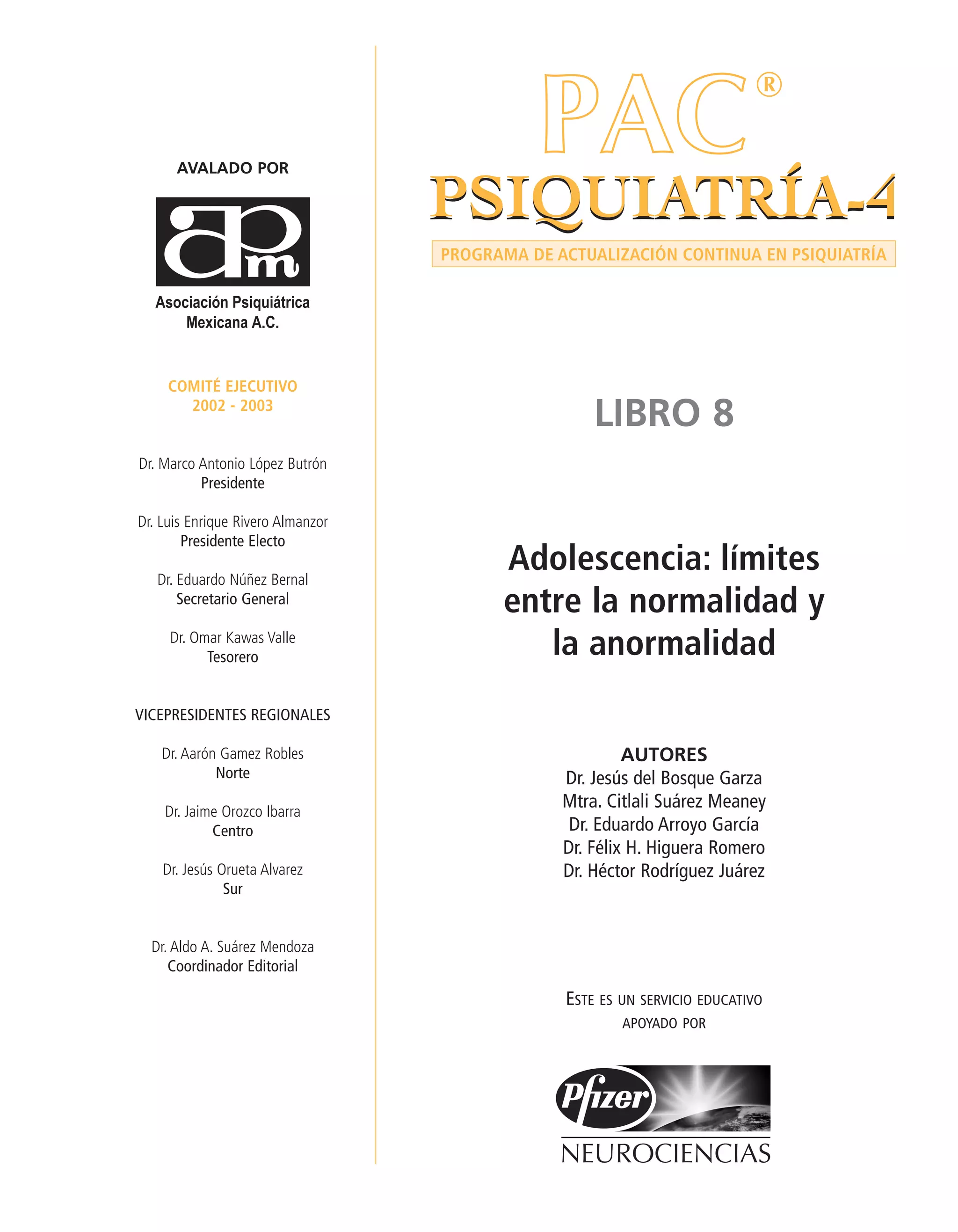 Este documento presenta información sobre la adolescencia y los límites entre la normalidad y la anormalidad en este periodo. Se incluye una lista de autores que escribieron el libro y se detallan los cargos y afiliaciones de cada uno. También se proporciona información sobre la editorial y el patrocinio del libro. El contenido cubre temas como el concepto de adolescencia, características normales y anormales del desarrollo en esta etapa, conducta, desarrollo psicosexual, psicopatología y trastornos