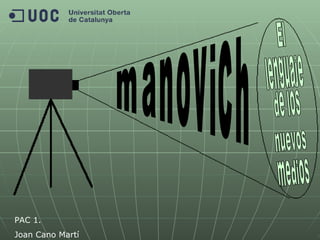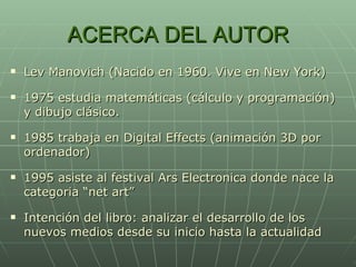 El documento resume los principales conceptos del libro "El lenguaje de los nuevos medios" de Lev Manovich. Explica que los nuevos medios se basan en la computación para su creación, almacenamiento, uso y distribución e incluyen internet, sitios web, realidad virtual y multimedia. También describe los principios clave de los nuevos medios como la representación numérica, modularidad, automatización y variabilidad.