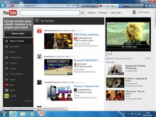 YouTube es un sitio web creado en 2005 para que los usuarios suban y compartan videos. Fue adquirido por Google en 2006 y ahora es propiedad de Google. Los usuarios pueden ver videos en alta definición (HD) y la calidad del video depende de la opción seleccionada. YouTube bloquea videos musicales, de maltrato animal y pornografía para evitar problemas legales. En 2011, YouTube introdujo un nuevo diseño gris con secciones a la izquierda y derecha para recomendar canales y videos.