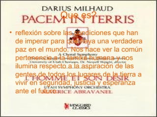 El documento resume la encíclica Pacem in Terris del Papa Juan XXIII. Explora las condiciones necesarias para la paz en el mundo, incluyendo el respeto por la dignidad humana y los derechos humanos, las relaciones justas entre los estados, y la necesidad de una autoridad política mundial para gobernar las relaciones internacionales. También describe las cinco partes de la encíclica y los temas que cubre, como la organización política de los estados y las normas que deben guiar la acción de los católicos.