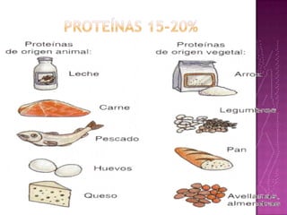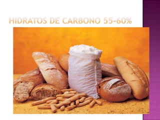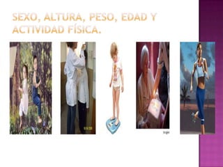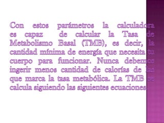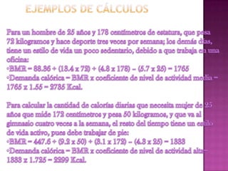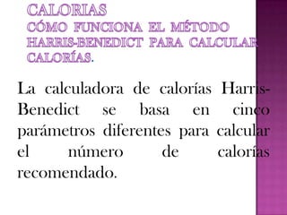 El documento describe diferentes métodos para calcular las calorías recomendadas y contiene tablas con el contenido calórico de varios alimentos. Explica que la calculadora de Harris-Benedict se basa en cinco parámetros como peso, edad, altura y actividad física. También resume que los macronutrientes principales son proteínas, grasas e hidratos de carbono y proveen la energía del cuerpo.