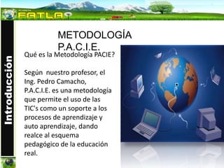 La metodología PACIE permite el uso de las TIC como soporte para los procesos de aprendizaje y autoaprendizaje, dando énfasis al esquema pedagógico de la educación real. Se divide en tres secciones: información, comunicación e interacción. La sección de información presenta detalles sobre el funcionamiento del curso. La sección de comunicación es una cartelera en línea para anuncios e inquietudes. La sección de interacción fomenta la construcción cooperativa del conocimiento entre estudiantes.