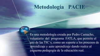 PACIE es una metodología educativa que utiliza las TIC como soporte para procesos de aprendizaje y autoaprendizaje. Consta de 5 fases: Presencia, Alcance, Capacitación, Interacción y E-learning. Su objetivo es crear estudiantes críticos mediante el acompañamiento y aprovechando recursos en internet, en lugar de simplemente reproducir la educación presencial en lo virtual.