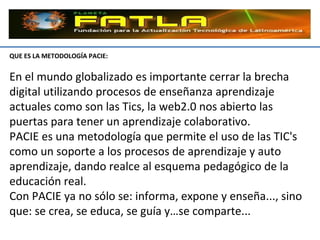 La metodología PACIE permite el uso de las TIC como soporte para procesos de aprendizaje y autoaprendizaje, dando énfasis a esquemas pedagógicos de educación real. PACIE consta de cinco fases: Presencia, Alcance, Capacitación, Interacción y E-Learning. El objetivo es cerrar la brecha digital mediante procesos de enseñanza-aprendizaje actuales y permitir un aprendizaje colaborativo.