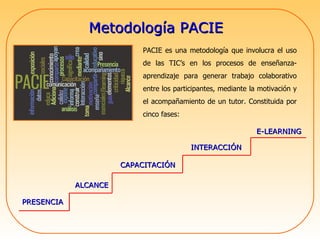 Este documento describe la metodología PACIE para cursos e-learning. PACIE consta de cinco fases (Presencia, Alcance, Capacitación, Interacción, E-learning) y propone estructurar los entornos virtuales de aprendizaje en tres bloques: información, comunicación e interacción. El bloque de información presenta al tutor y los detalles del curso. El bloque de comunicación permite que el tutor se comunique con los estudiantes. El bloque de interacción apoya el aprendizaje colaborativo entre los estudiantes