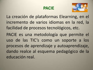 Este documento describe la metodología PACIE para el aprendizaje en línea. PACIE utiliza las TIC como soporte para el aprendizaje autodirigido y respalda los esquemas pedagógicos de la educación tradicional. El bloque 0 de PACIE, el más importante, es el eje de la interacción en el aula virtual y la fuente del conocimiento cooperativo. El aula virtual se divide en secciones de información, comunicación e interacción para presentar el curso, facilitar el proceso de aprendizaje y fomentar la socializ