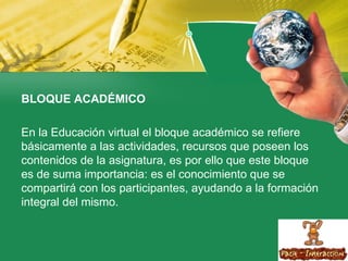 El documento describe los componentes clave del bloque académico en la educación virtual. El bloque académico debe contener cuatro secciones: exposición, rebote, construcción y comprobación. La sección de exposición proporciona información y recursos. La sección de rebote evalúa la comprensión de los estudiantes. La sección de construcción fomenta el análisis, debate y generación de nuevo conocimiento. Y la sección de comprobación verifica los resultados a través de síntesis y evaluaciones.