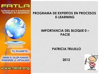 Este documento describe la metodología PACIE para el aprendizaje en línea. PACIE se divide en cuatro fases (presencia, e-learning, interacción y capacitación) y el aula virtual se estructura en tres bloques (PACIE, académico y de cierre). El bloque 0 PACIE es importante porque presenta el curso, genera interacción motivadora entre estudiantes y permite la generación colaborativa de conocimientos.