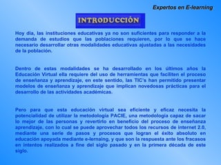 El documento describe la metodología PACIE para la educación virtual. PACIE es una metodología que busca sacar lo mejor de las personas y mejorar el proceso de enseñanza-aprendizaje mediante el uso de recursos de internet y una serie de pasos. La metodología propone estructurar los cursos virtuales en bloques operativos, administrativos y académicos para guiar a los estudiantes y tutores de manera eficiente a través de las distintas etapas del curso.