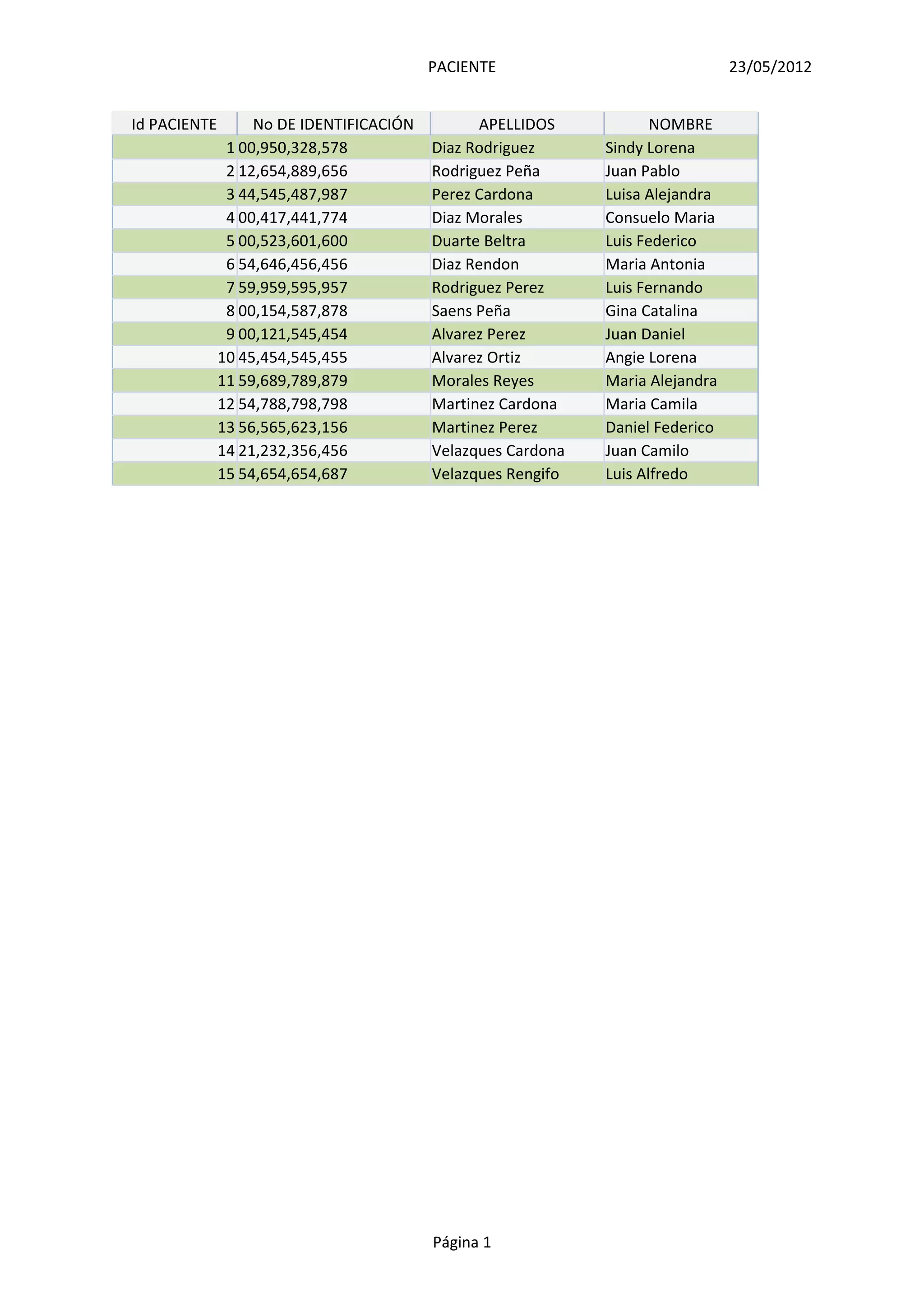 Este documento contiene información sobre 15 pacientes que incluye su número de identificación, nombre, edad, fecha de nacimiento, sexo, fecha de última consulta, doctor a cargo, especialidad del doctor, teléfono del doctor y dirección del paciente. La información está organizada en tablas que detallan los datos de cada paciente.