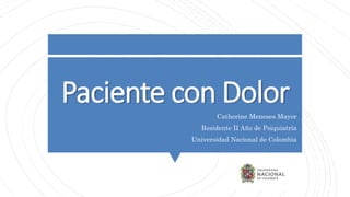 Este documento discute el manejo del dolor desde una perspectiva psiquiátrica. Explica que existe una relación bidireccional entre el dolor crónico y los trastornos mentales, y que los antidepresivos, anticonvulsivantes y terapia cognitivo-conductual son opciones de tratamiento no farmacológico útiles. También señala que debido a la falta de capacitación en estos campos, el manejo de pacientes con dolor y trastornos psiquiátricos comórbidos es un desafío para todos los prove