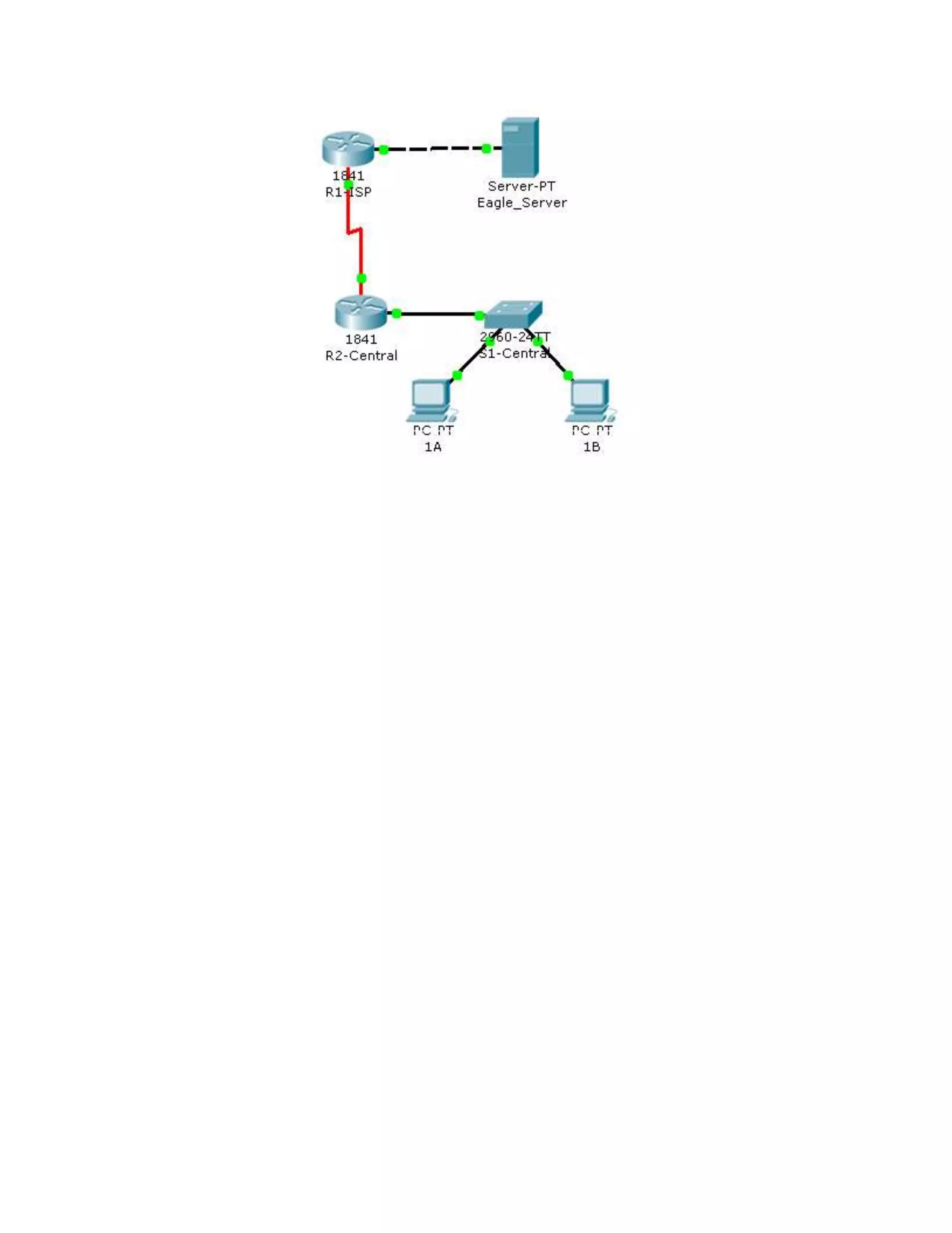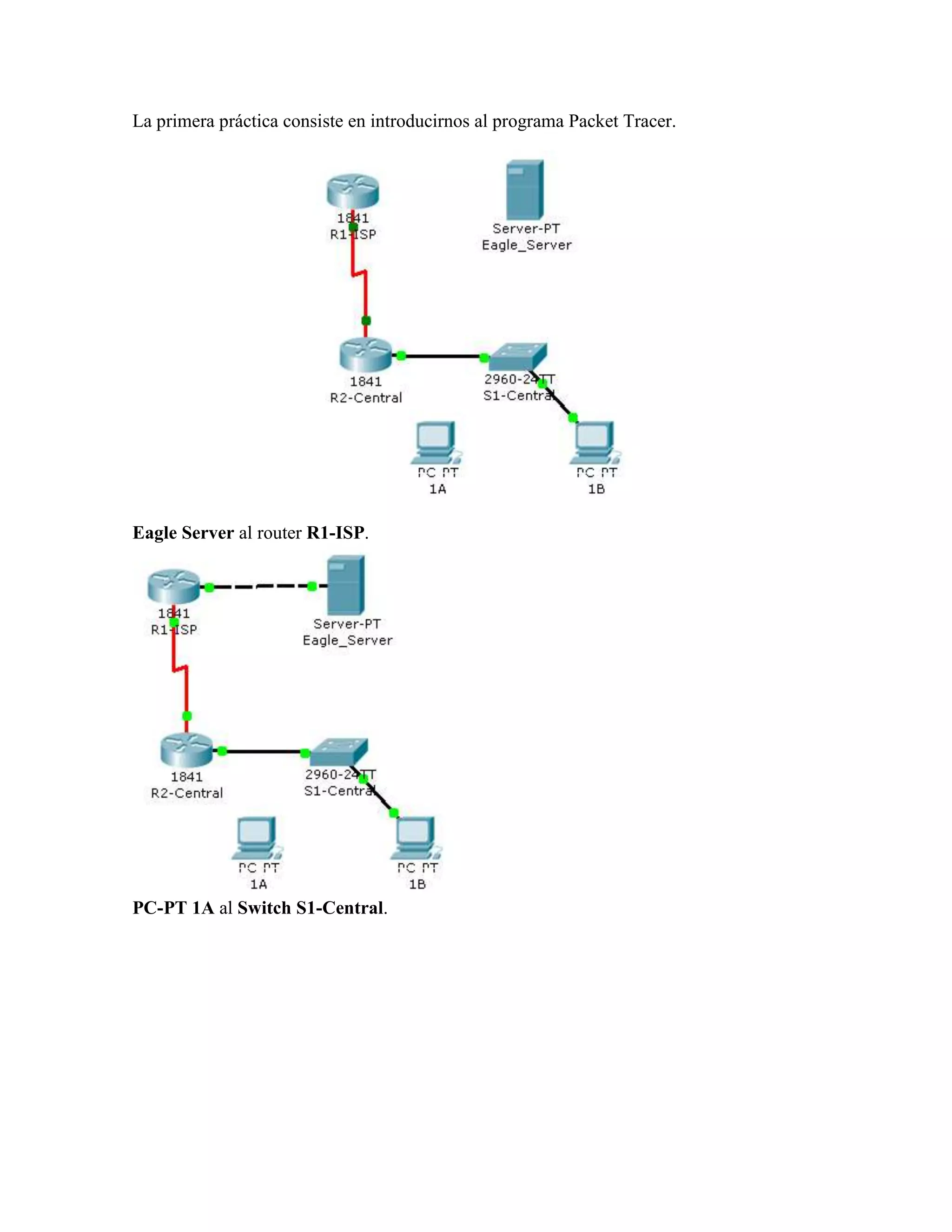 Este documento presenta tres pasos para configurar una red en Packet Tracer: introducirse al programa Packet Tracer, conectar el servidor Eagle al router R1-ISP, y conectar la PC-PT 1A al switch S1-Central.