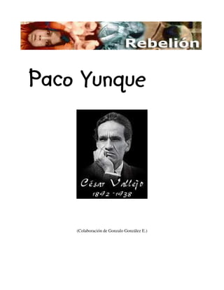 Este documento narra la primera experiencia de Paco Yunque en la escuela primaria. Al llegar, se siente abrumado y asustado por la cantidad de niños jugando ruidosamente en el patio. Dos niños lo llevan a su salón de clase donde permanece callado y asustado hasta que el profesor lo coloca junto a otro niño llamado Paco Fariña. Sin embargo, el niño rico de la clase, Humberto Grieve, intenta llevarse a Paco Yunque a su carpeta, generando un conflicto con el prof
