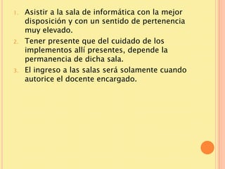 Este documento establece las normas y responsabilidades para el uso adecuado de la sala de informática del colegio. Los estudiantes deben asistir con buena disposición y cuidar los equipos. Solo pueden ingresar cuando el profesor lo autorice y deben trabajar solo en el puesto asignado, en silencio y atendiendo las instrucciones del docente. Se prohíbe el uso de internet y redes sociales para fines no educativos o que atenten contra la moral, así como consumir alimentos, tirar basura o mover equipos sin perm