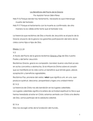 El documento describe los beneficios del Pacto de la Gracia que Dios estableció con la humanidad a través de Jesucristo. El Pacto de la Gracia nos garantiza la participación en el reino de los cielos como hijos de Dios y nos ofrece gracia, paz, bendición, redención, perdón de pecados, sabiduría, y la herencia eterna a través de la muerte y resurrección de Cristo. El Espíritu Santo sella esta herencia en nosotros como hijos de Dios.