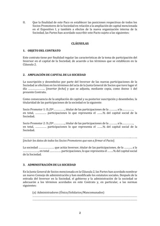 El documento detalla un pacto de socios con inversor que regula la inversión y las relaciones entre los socios fundadores de una empresa y un inversor. Incluye cláusulas sobre la ampliación de capital, administración de la sociedad, derecho de información y otros aspectos clave para proteger las partes involucradas. Se enfatiza la importancia de formalizar el pacto ante notario debido a la naturaleza de las transacciones involucradas.