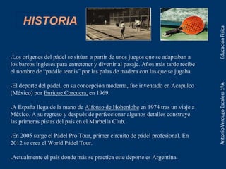 El documento resume la historia y los aspectos técnicos y reglamentarios del pádel. Brevemente, explica que el pádel se originó en Inglaterra como entretenimiento para pasajeros de barco y fue modernizado en México en 1969, llegando a España en 1974. Describe las dimensiones de la cancha, red, palas y pelotas, así como las reglas básicas del juego y scoring. Finalmente, detalla varios golpes técnicos como derechas, revés, voleas y globos.