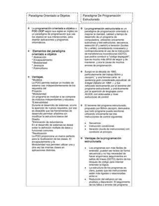 El documento compara y contrasta los paradigmas de programación orientada a objetos y estructurada. Explica que la programación orientada a objetos usa objetos y sus interacciones para diseñar aplicaciones, mientras que la programación estructurada se enfoca en mejorar la claridad y calidad usando solo tres estructuras de control. También discute ventajas como la reutilización de código y facilidad de mantenimiento en ambos paradigmas.