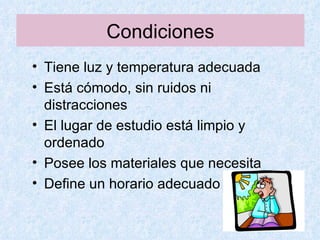 Este documento ofrece consejos sobre hábitos de estudio efectivos y la importancia de que los padres se interesen por el aprendizaje de sus hijos. Recomienda que el lugar de estudio tenga luz y temperatura adecuadas, sea cómodo y ordenado. Además, sugiere establecer un horario fijo de estudio diario y dividir el tiempo de estudio en secciones de 15 minutos para cada asignatura. Finalmente, enfatiza la importancia de que los padres mantengan conversaciones sobre el aprendizaje escolar de sus hijos para comprender mejor