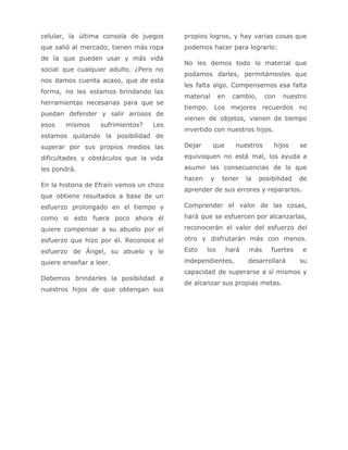 El documento resalta la importancia de fomentar la independencia y el esfuerzo en los niños, contrastando la historia de Efraín, quien logró terminar la primaria tras un sacrificio, con la tendencia actual de los padres a dar todo a sus hijos sin que ellos lo valoren. Se advierte que el exceso de comodidades y la falta de retos impiden a los niños desarrollar habilidades para enfrentar las dificultades de la vida. Se propone que los padres deben invertir tiempo de calidad en lugar de proporcionar constantemente objetos materiales, permitiendo que los hijos aprendan de sus errores y comprendan el valor del esfuerzo.
