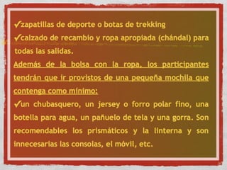El documento presenta el programa de actividades de una semana verde que se llevará a cabo del 6 al 9 de abril en el Bajo Cinca y Sobrarbe. El programa incluye salidas en bicicleta de montaña, descenso de barrancos, circuitos de aventura, espeleología, visitas a pueblos y paseos. Las actividades están dirigidas a acercar la naturaleza y el deporte a los participantes de forma divertida.