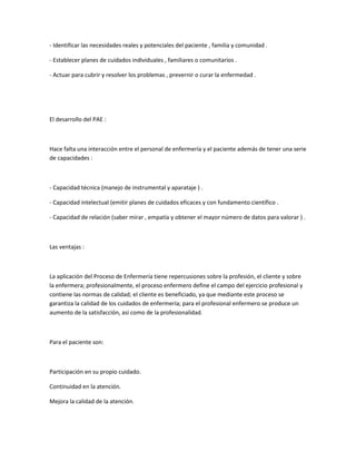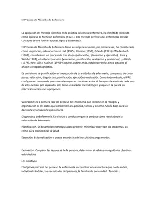 El documento describe el Proceso de Atención de Enfermería (PAE), que consiste en cinco etapas clave para prestar cuidados de enfermería de manera sistemática y racional: valoración, diagnóstico, planificación, ejecución y evaluación. El PAE surgió en la década de 1950-1960 como un método para estructurar la práctica enfermera basada en la recopilación y el análisis de datos para identificar problemas y necesidades del paciente y desarrollar planes de cuidado individualizados.