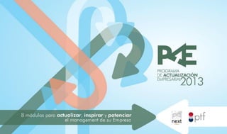 El documento resume un programa de actualización empresarial (PAE) que ofrece 96 horas de capacitación en 8 módulos de 12 horas cada uno sobre temas de gestión empresarial. Cada módulo es impartido por un experto e incluye conceptos, habilidades prácticas y casos de empresas exitosas. El programa busca ampliar la visión de ejecutivos a través de valores humanos para transformar sus capacidades.