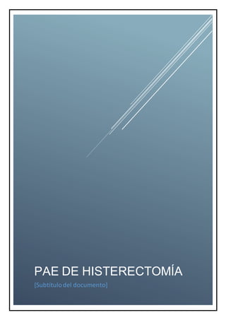 Este documento presenta un plan de cuidados de enfermería para una paciente que se sometió a una histerectomía. Resume la historia clínica de la paciente, incluyendo sus signos vitales y evaluaciones usando los 11 patrones de Gordon. Identifica diagnósticos de enfermería como dolor, riesgo de infección e insomnio. Finalmente, proporciona una exploración física detallada y una evaluación de los patrones funcionales.