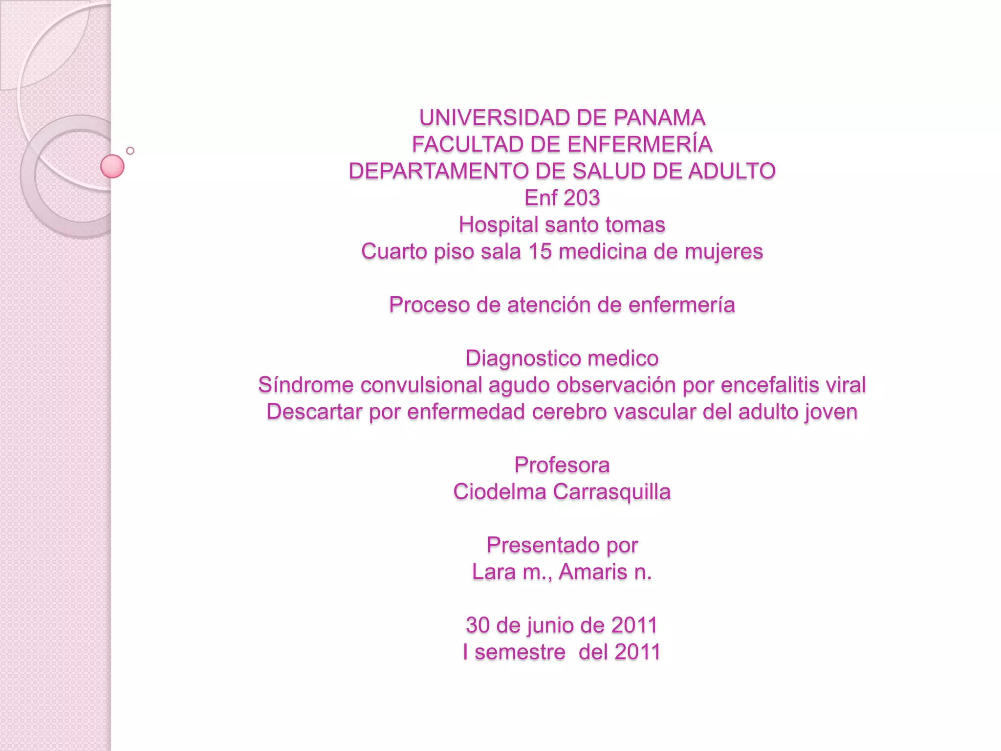 Este documento presenta el caso de una paciente de 34 años que ingresó al hospital por presentar convulsiones. Se sospecha de encefalitis viral o enfermedad cerebrovascular. Se realizaron exámenes de laboratorio y diagnósticos de enfermería. El resumen incluye intervenciones de enfermería para controlar las convulsiones, reducir el dolor y la ansiedad.