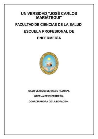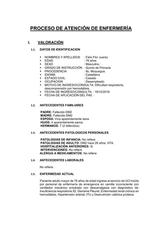 Este documento presenta el caso clínico de un paciente de 76 años que ingresó a la unidad de cuidados intensivos con insuficiencia respiratoria, derrame pleural, enfermedad renal crónica y otras condiciones. Se describe la valoración inicial del paciente, incluyendo antecedentes, examen físico y resultados de exámenes. Se identifican varios problemas de enfermería y se proponen objetivos e intervenciones para abordar el patrón respiratorio ineficaz, riesgo de infección y otros problemas.