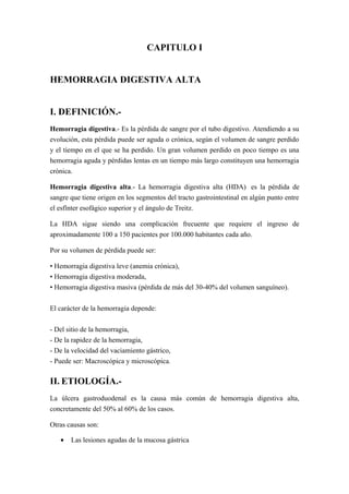 Este documento describe el proceso de atención de enfermería para pacientes con hemorragia digestiva alta en el Hospital de Chancay. Explica la definición, etiología, fisiopatología y anatomía relevante de la hemorragia digestiva alta, incluidas las úlceras pépticas, gastritis y síndrome de Mallory-Weiss. El documento también proporciona detalles sobre el departamento de enfermería y su jefe, así como el proceso de atención para este tipo de pacientes.