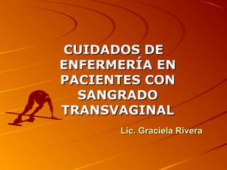 Este documento describe los cuidados de enfermería para pacientes con sangrado transvaginal. Explica el proceso de atención de enfermería, incluidas las fases de valoración, diagnóstico, planificación, implementación y evaluación. Luego describe los cuidados específicos para abortos espontáneos, incluida la valoración, diagnósticos comunes, planes de cuidado y resultados esperados.
