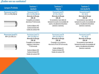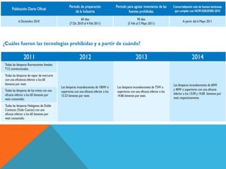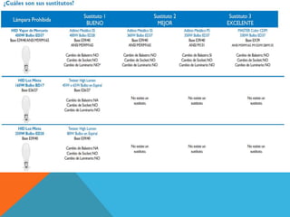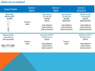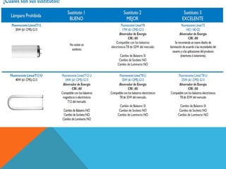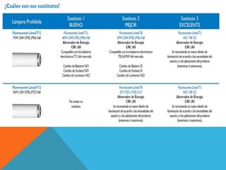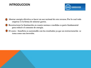 Este documento presenta un resumen del Programa de Ahorro de Energía Empresarial de G&G Iluminación. El programa busca ayudar a las empresas a controlar y optimizar la iluminación en sus instalaciones de manera rentable mediante la reestructuración de la iluminación y el uso de productos de alta eficiencia energética. La nueva Norma Oficial Mexicana NOM-028-ENER-2010 regula la eficiencia energética de fuentes luminosas y entrará en vigor luego de un periodo de transición de 150 días para que la