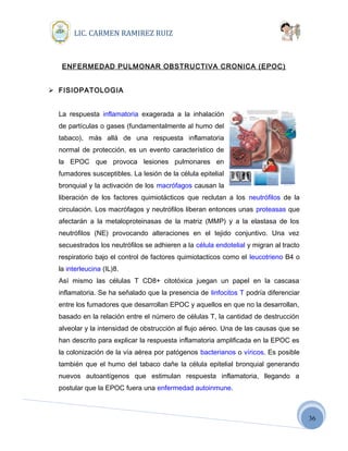 Este documento describe la enfermedad pulmonar obstructiva crónica (EPOC), su fisiopatología, clasificación, etiología, manifestaciones clínicas, diagnóstico y tratamiento. También describe la insuficiencia cardíaca congestiva, su clasificación según la NYHA, manifestaciones clínicas y neumonía adquirida en la comunidad. El documento provee información detallada sobre estas tres condiciones para el departamento de enfermería de un hospital.