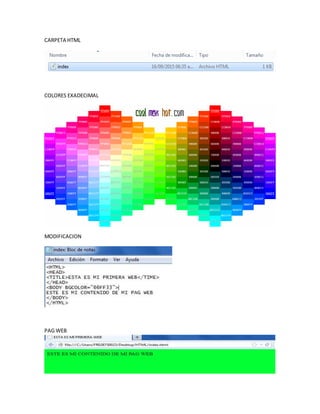 Este documento proporciona información sobre las etiquetas y elementos básicos para crear una página web, incluyendo etiquetas para estructura (<HTML>, <HEAD>, <BODY>), comentarios, saltos de línea, texto preformateado, separadores, formato de texto, encabezados, marquesinas y párrafos.