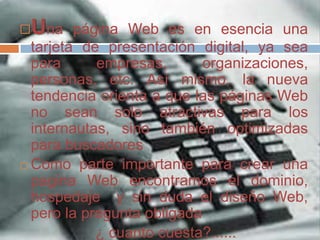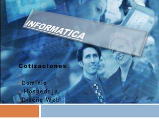 Este documento presenta cotizaciones para los servicios necesarios para crear un sitio web, incluyendo el registro de dominio, hospedaje y diseño web. Proporciona varias opciones de proveedores para cada servicio con sus precios respectivos, los cuales varían desde $450 hasta $2150 pesos mexicanos dependiendo del nivel y características incluidas. El registro de dominio es necesario para identificar el sitio de manera única, mientras que el hospedaje permite que el contenido esté disponible en internet las 24 horas. Finalmente, el