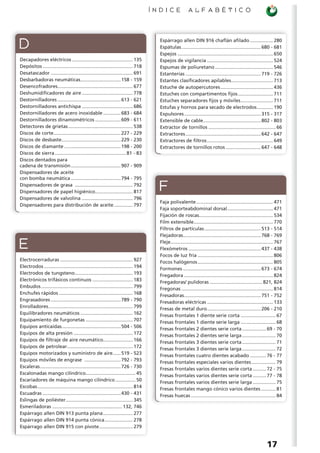 Este documento presenta un índice alfabético de productos industriales. Incluye categorías como herramientas manuales, equipos de protección personal, maquinaria, accesorios y suministros. Cubre más de 800 artículos ordenados de la A a la Z, desde aceites y engrases hasta zunchos y tuercas. Proporciona números de página o rangos para encontrar información detallada sobre cada producto en el catálogo completo.