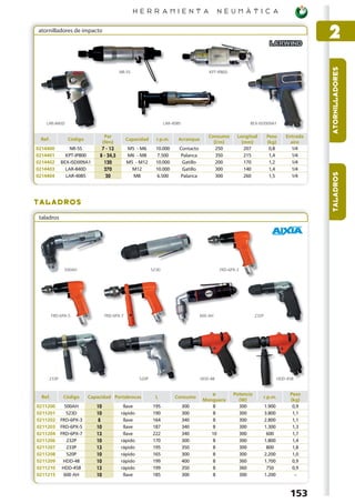 Este documento presenta una lista de herramientas neumáticas incluyendo atornilladores de impacto y taladros. Proporciona detalles técnicos como capacidad, velocidad, consumo de aire, longitud y peso para cada herramienta referenciada por código.