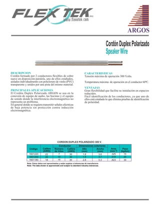 Este documento describe un cordón duplex polarizado de 300 voltios con dos conductores flexibles de cobre aislados individualmente con PVC transparente. Se usa para transmitir señales eléctricas de baja potencia en equipo de audio y sonido donde no hay interferencia electromagnética. Tiene una tensión máxima de 300 voltios, temperatura máxima de 60°C, y es fácil de identificar los conductores ya que uno está estañado.
