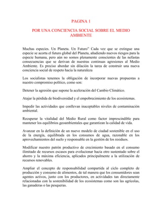 El documento destaca la necesidad de construir una conciencia social sobre el medio ambiente y propone siete objetivos para los socialistas: detener el cambio climático, atajar la pérdida de biodiversidad, impedir la contaminación, recuperar el medio rural, avanzar hacia ciudades sostenibles, modificar el patrón de consumo ilimitado de recursos, y ampliar la responsabilidad compartida en la producción y consumo de alimentos.