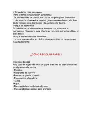Este documento explica cómo reciclar papel en casa. Define el reciclaje como someter materiales usados a un proceso para volver a usarlos. Algunas razones para reciclar son reducir residuos, ahorrar energía y preservar recursos. Luego detalla los pasos para reciclar papel: 1) cortar el papel en trozos pequeños y dejarlos en agua, 2) licuar la pulpa con agua, 3) colocar la pulpa en un marco para formar hojas de papel, y 4) prensar y secar las hojas.