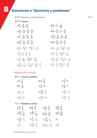 Este documento presenta una serie de ejercicios y problemas relacionados con operaciones con fracciones como suma, resta, multiplicación y división. Incluye ejemplos resueltos de cada tipo de operación y problemas para que el estudiante resuelva, con soluciones al final. El objetivo es que los estudiantes practiquen diferentes tipos de operaciones con fracciones y aprendan a simplificar y reducir los resultados.