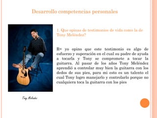 El documento habla sobre el desarrollo de competencias personales. Contiene preguntas y respuestas sobre el testimonio de vida de Tony Meléndez, un músico que toca la guitarra con los pies; las razones por las que algunas personas famosas caen en la drogadicción; y creencias potenciadoras que motivan a alcanzar metas.