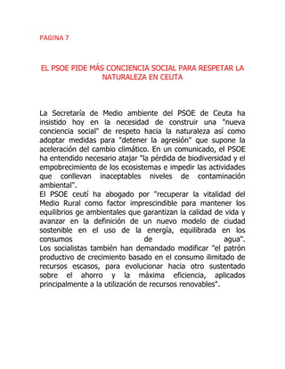 El PSOE de Ceuta pide construir una nueva conciencia social para respetar la naturaleza y detener la agresión del cambio climático, abogando por recuperar el medio rural y avanzar hacia un modelo de ciudad sostenible con un uso equilibrado de la energía y el agua, además de modificar el patrón de crecimiento basado en el consumo ilimitado de recursos hacia uno de ahorro y eficiencia aplicado a recursos renovables.