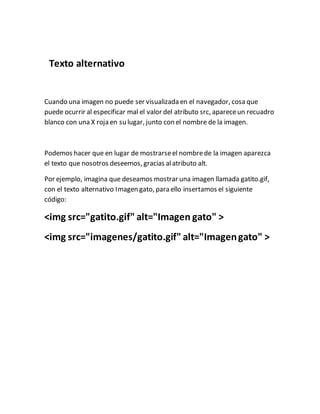 El documento explica cómo insertar imágenes en páginas web utilizando la etiqueta <img> y sus atributos src y alt. El atributo src especifica la ruta de la imagen y el atributo alt permite proporcionar un texto alternativo que se mostrará en caso de que la imagen no pueda visualizarse.