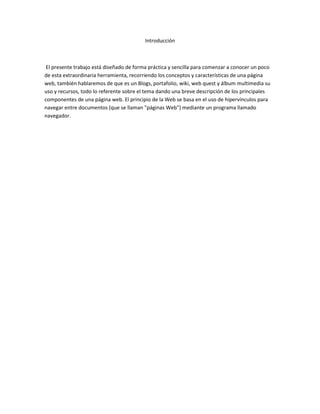 Este documento define y describe varios tipos de herramientas web como páginas web, blogs, portafolios digitales, wikis, webquests y el significado de las siglas "WWW". Explica que una página web es un documento electrónico alojado en un servidor que puede ser accedido a través de un navegador, y que un blog permite a cualquiera expresar ideas de manera colaborativa. También describe portafolios digitales, wikis y webquests como herramientas educativas, y explica que las siglas "