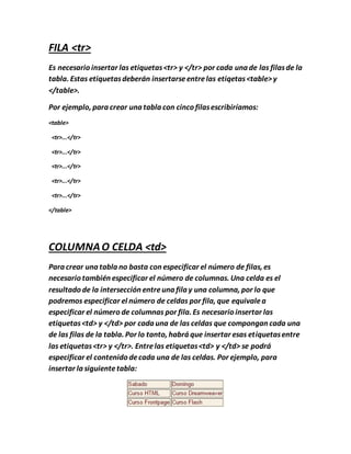 El documento explica cómo crear tablas en HTML utilizando etiquetas como <table>, <tr>, y <td>. Las tablas están formadas por celdas creadas por la intersección de filas y columnas. Se pueden modificar atributos de la tabla y celdas como el ancho, borde, alineación y color de fondo.