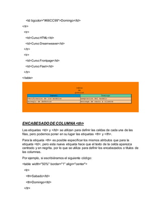 El documento describe las tablas en HTML, incluyendo sus elementos como filas, celdas, encabezados y atributos. Explica cómo crear tablas básicas y cómo combinar celdas utilizando los atributos colspan y rowspan. También muestra ejemplos de código HTML para ilustrar el uso de estas características de las tablas.