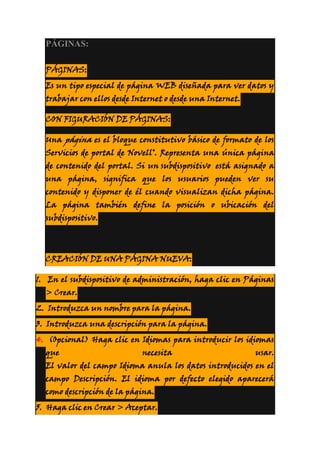 Este documento explica cómo crear y configurar páginas y encabezados de página en un portal de Novell. Describe los pasos para crear una nueva página, incluyendo asignar un nombre, descripción e idioma. También explica cómo crear un encabezado o pie de página común para todas las páginas insertando texto o gráficos en las áreas correspondientes.