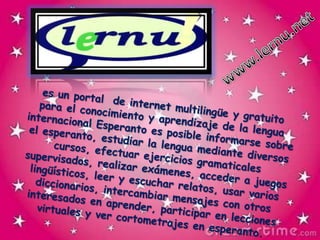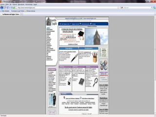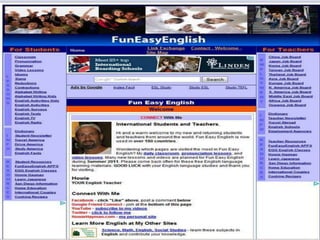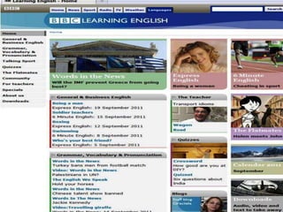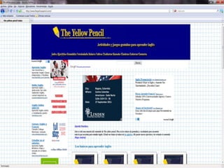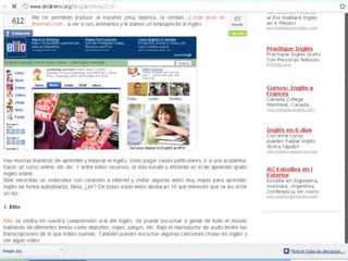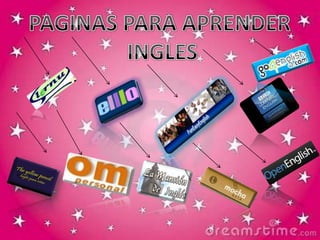 El documento presenta varias páginas web para aprender inglés, incluyendo recursos gratuitos para estudiar gramática, vocabulario, pronunciación, realizar ejercicios y exámenes. Algunos sitios también ofrecen cursos para diferentes niveles, desde principiantes hasta avanzados, y certificados para aquellos que aprueben los exámenes. Las páginas utilizan diversos formatos como lecciones, videos, audios y juegos para enseñar inglés de manera interactiva.